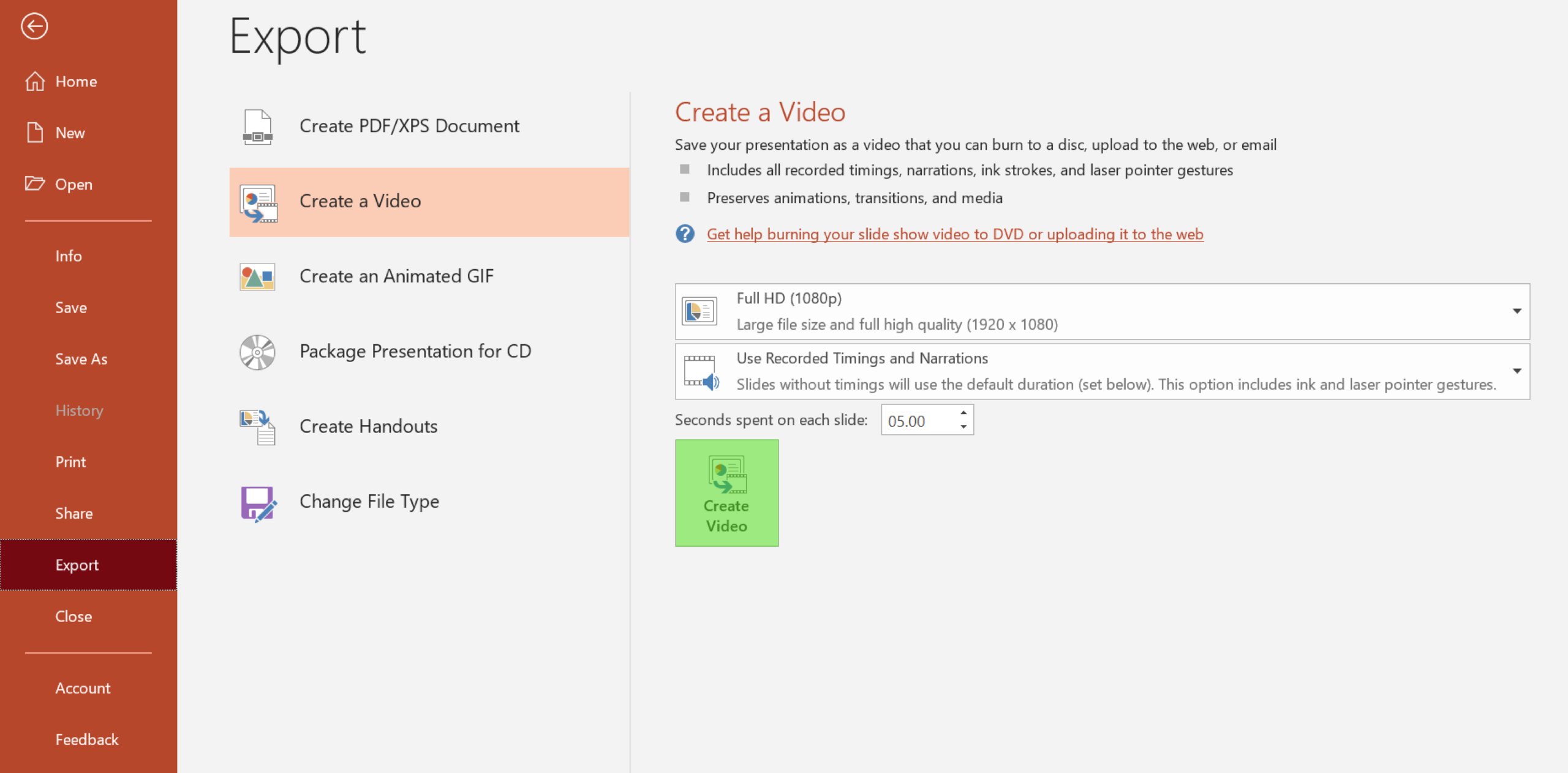 12. To save your recording as a video, toggle the menu and click Export. Choose the option Create a Video, opting for Full HD (1080p).
