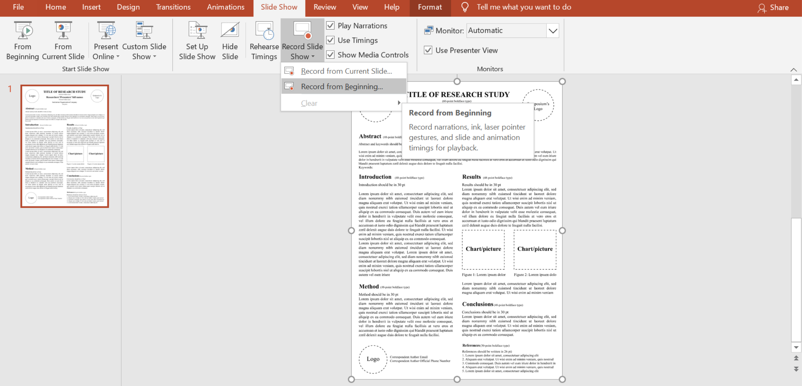 2. Show your poster as a single slide in full screen. Here is the link for your poster layout template in Poster Template PPTX.